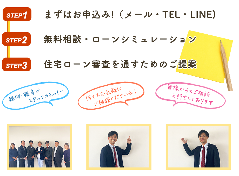 | 転職をしてまだ1か月でしたが、当時の狭いアパートでの家族4人暮らしは、家族のストレスとなっているようで新築の購入を検討し始めました、勤続年数が短いという悩みの解決を一緒に考えてくれた担当者の方に感謝です。 | |||